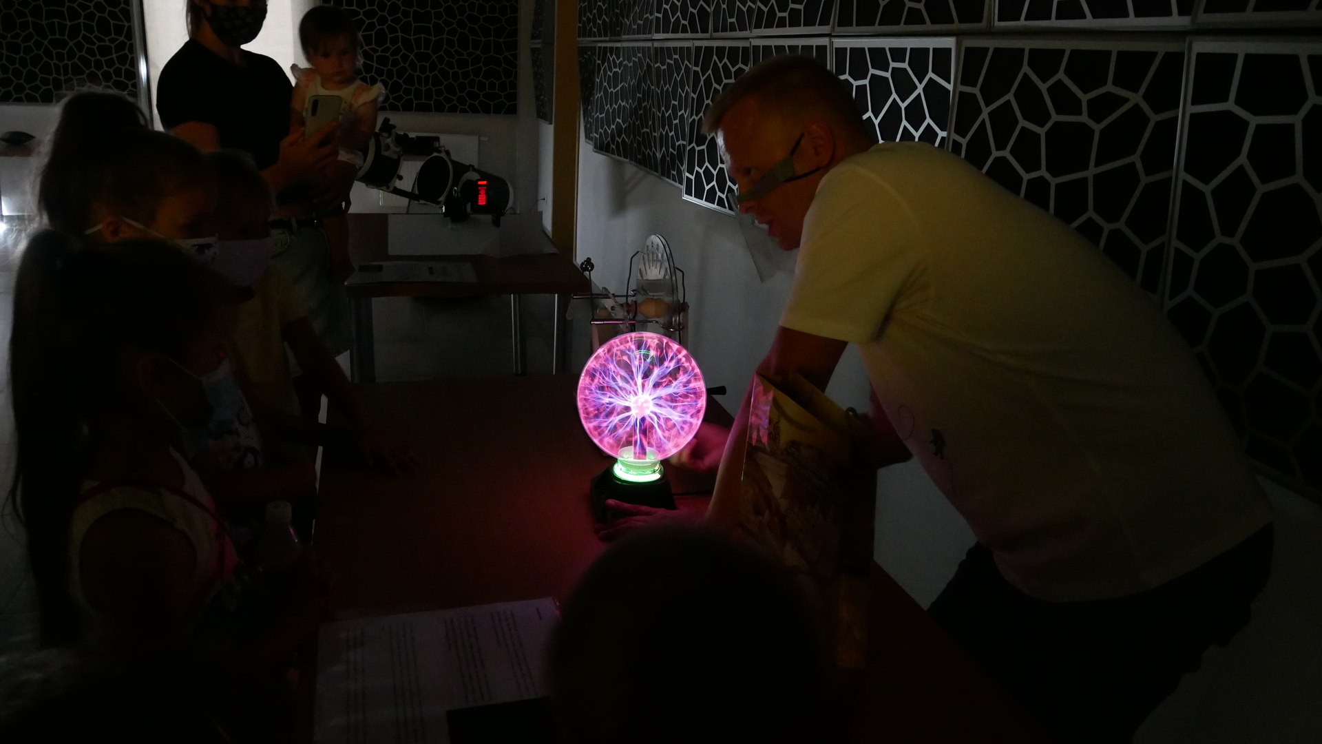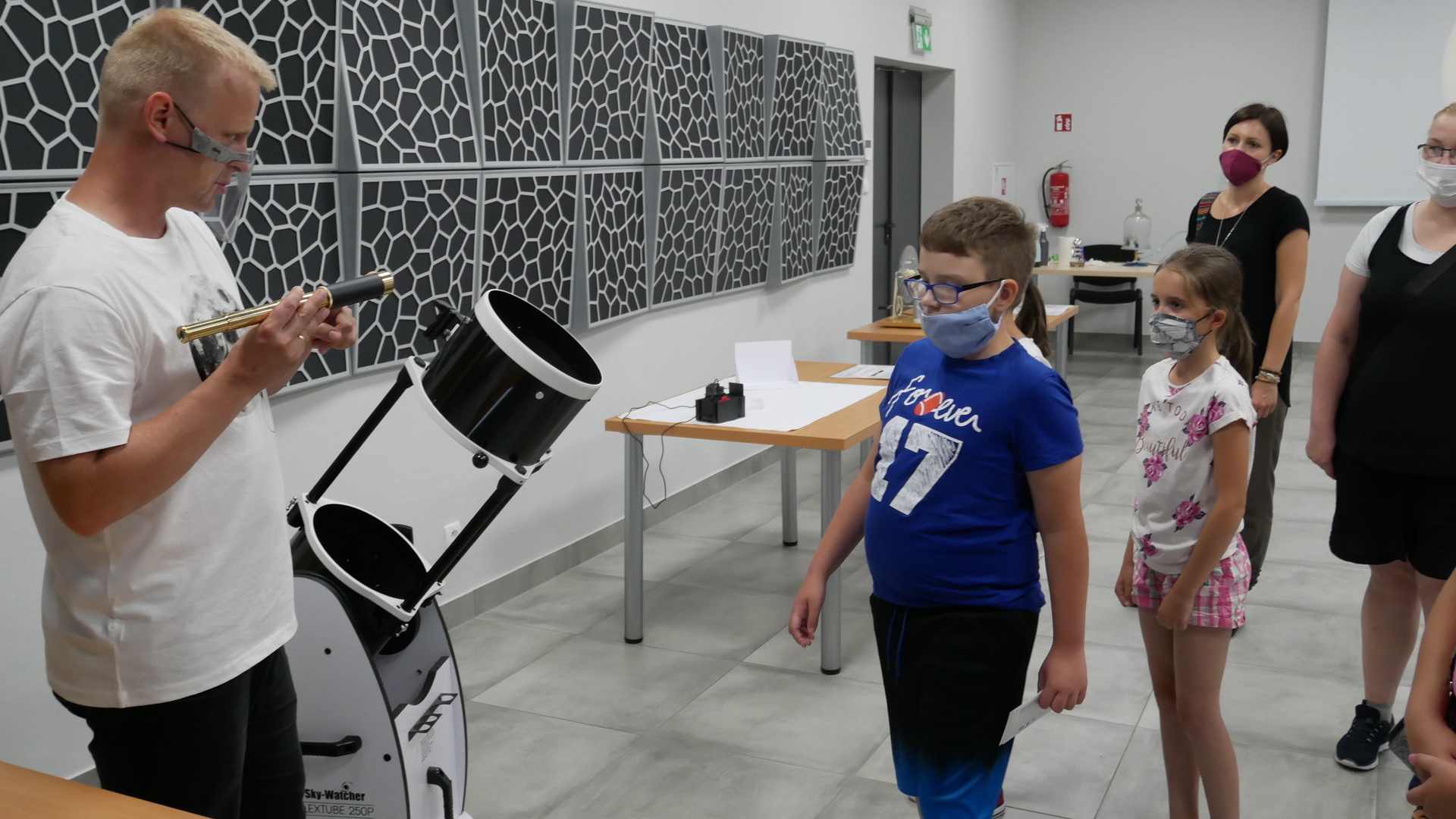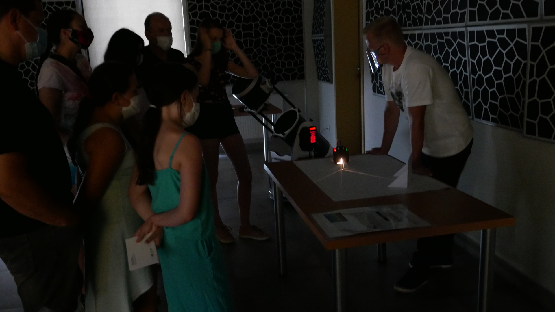 W środę 29 lipca w 2020r. Astro Centrum w Chełmcu odbył się dzień otwarty. Można powiedzieć, że był to dzień doświadczeń, gdyż sale Astro wypełnione były różnego rodzaju przyrządami i pomocami naukowymi do przeprowadzania doświadczeń. Można było posłuchać i zobaczyć jak przebiegał lot załogowy misji APOLLO na księżyc na przykładzie modelu z klocków LEGO, objaśnione było też zjawisko złudzenia optycznego, omówienie prawa odbicia i prawa załamania światła, gotowaliśmy też wodę w próżni oraz zapalali żarówki przy kuli plazmowej. Niestety zajęcia przebiegały w reżimie sanitarnym, ale pomimo to cieszyły się ogromnym zainteresowaniem zarówno ze strony małych jak i większych osób.