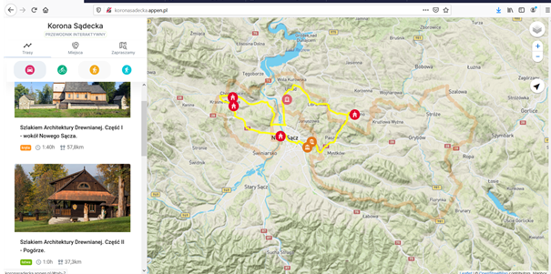 Ponadto stworzono wycieczki samochodowe, rowerowe, piesze oraz spacery po obszarze LGD „KORONA SĄDECKA”, które również oznaczono na mapie interaktywnej.