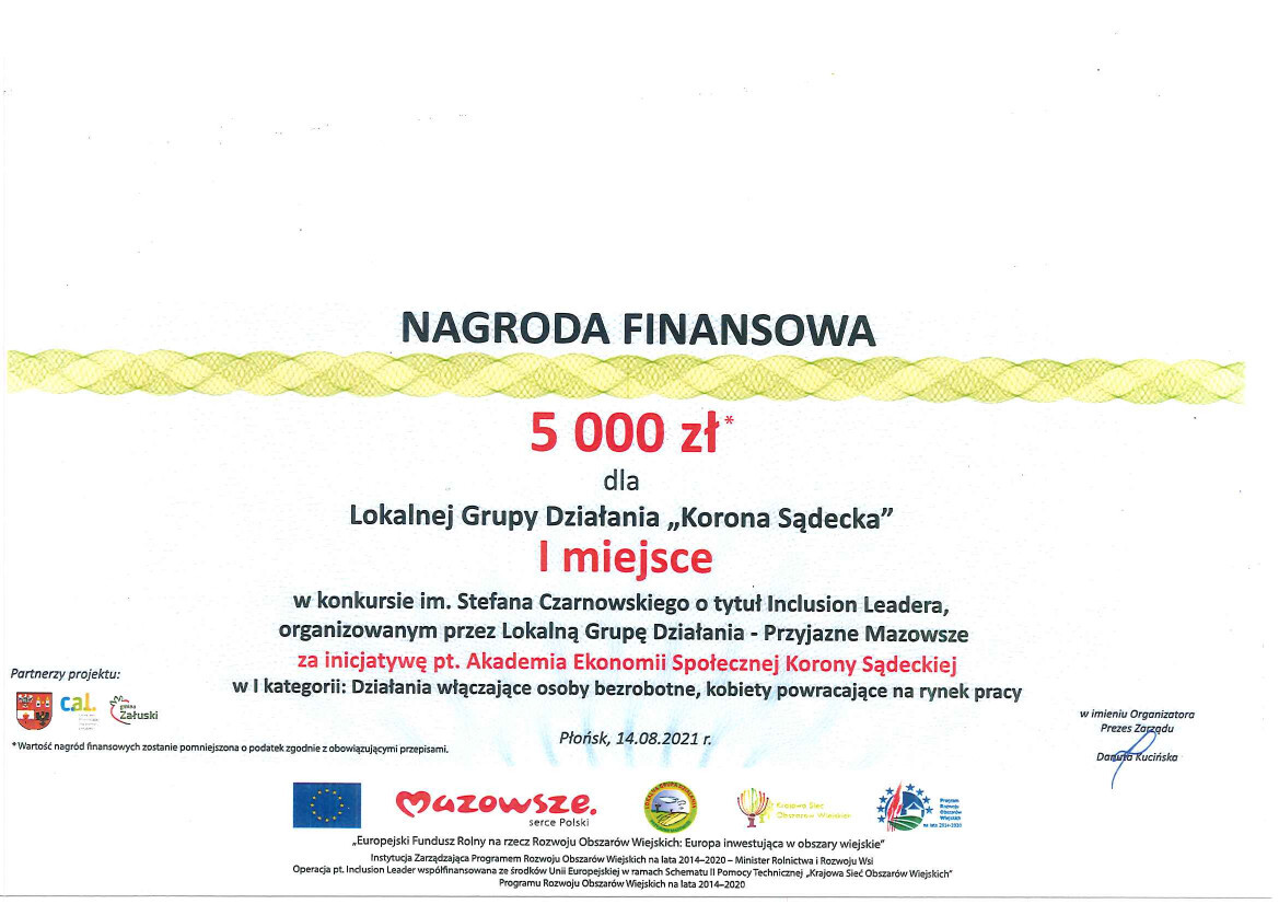 Informujemy, że Lokalna Grupa Działania "Korona Sądecka" zajęła I miejsce w konkursie im. Stefana Czarnowskiego o tytuł Inclusion Leadera za inicjatywę pt. "Akademia Ekonomi Społecznej Korony Sądeckiej". Inicjatywa ta obejmowała działania włączające osoby bezrobotne i kobiety powracające na rynek pracy. Otrzymane 5 000,00 zł nagrody, zostanie przeznaczone na cele statutowe stowarzyszenia.