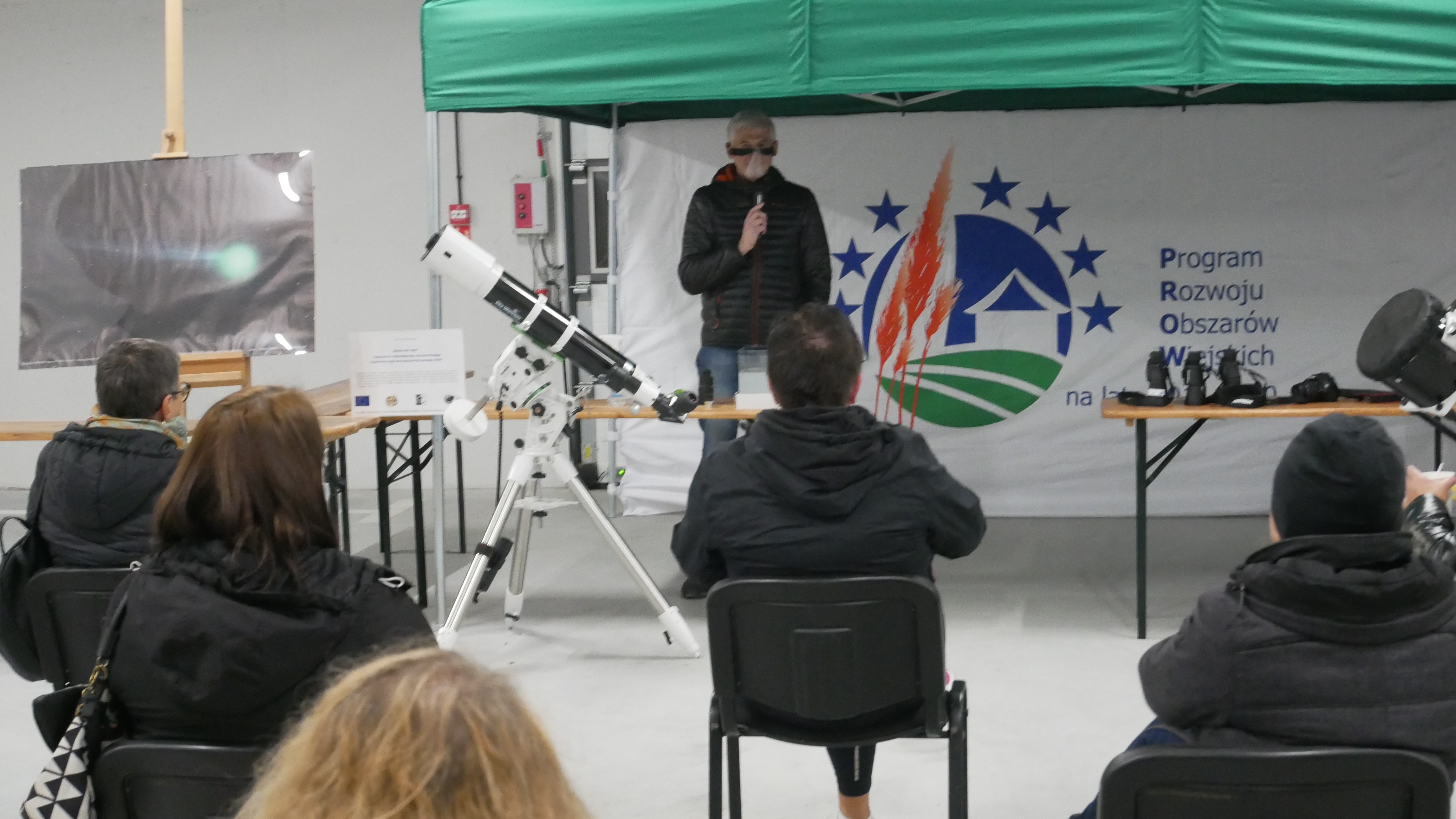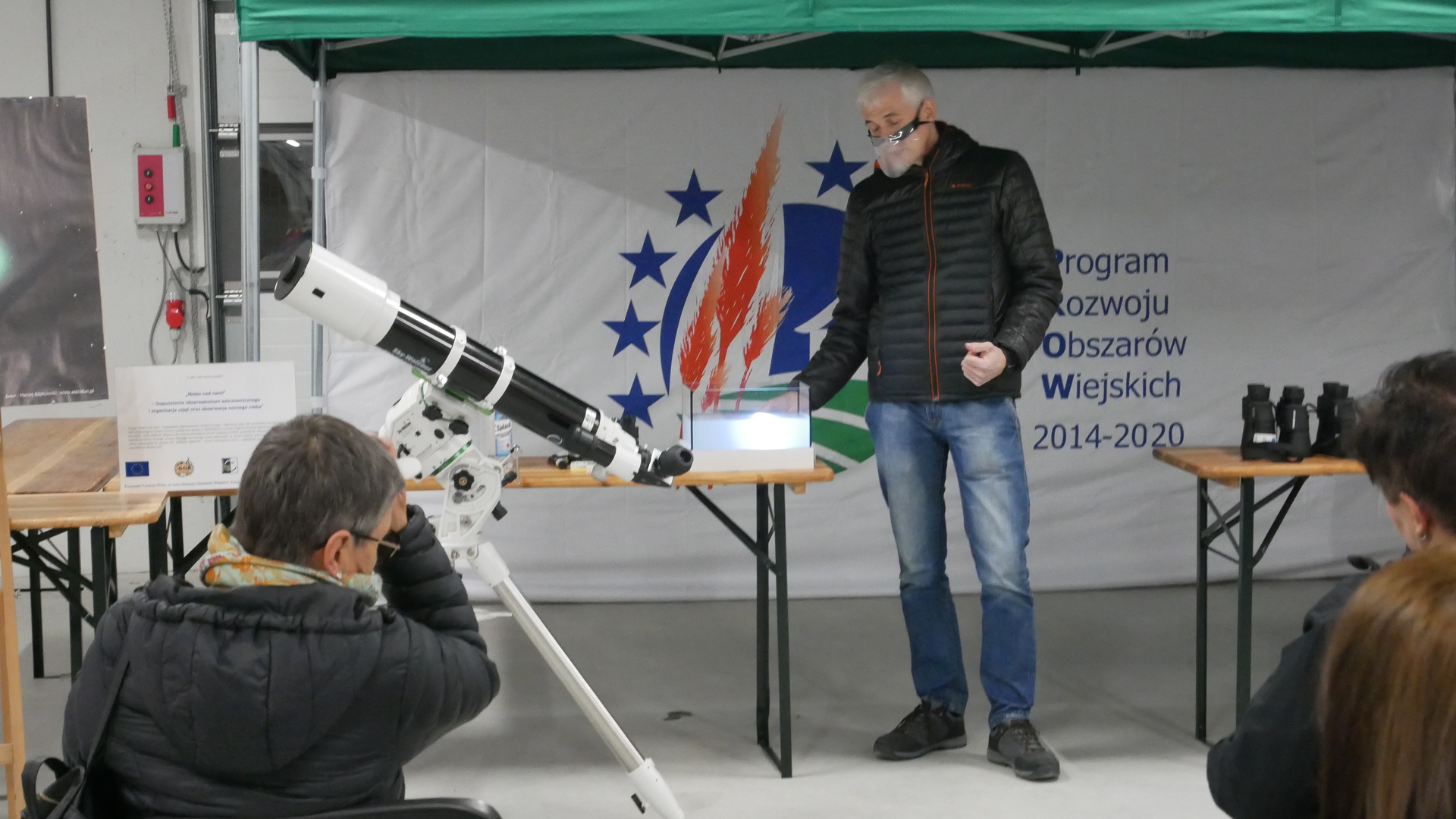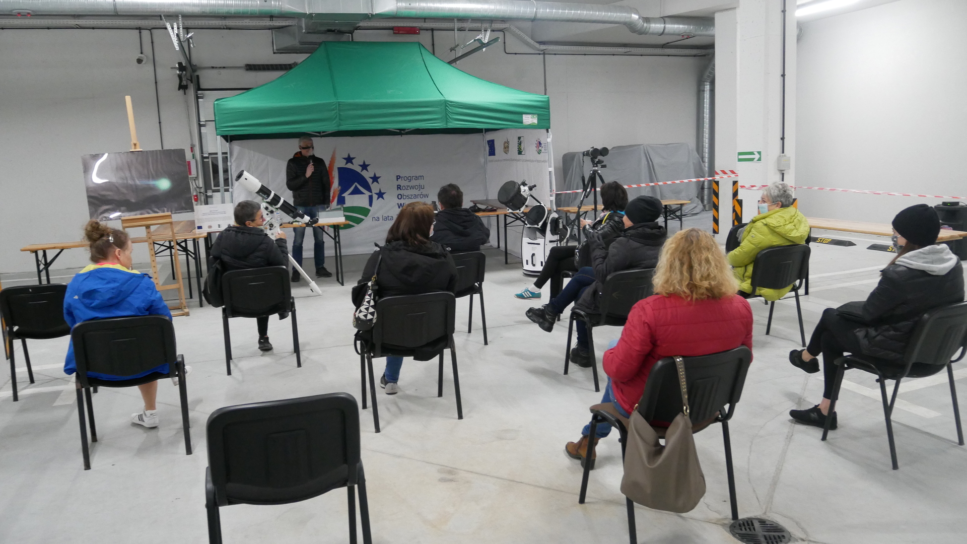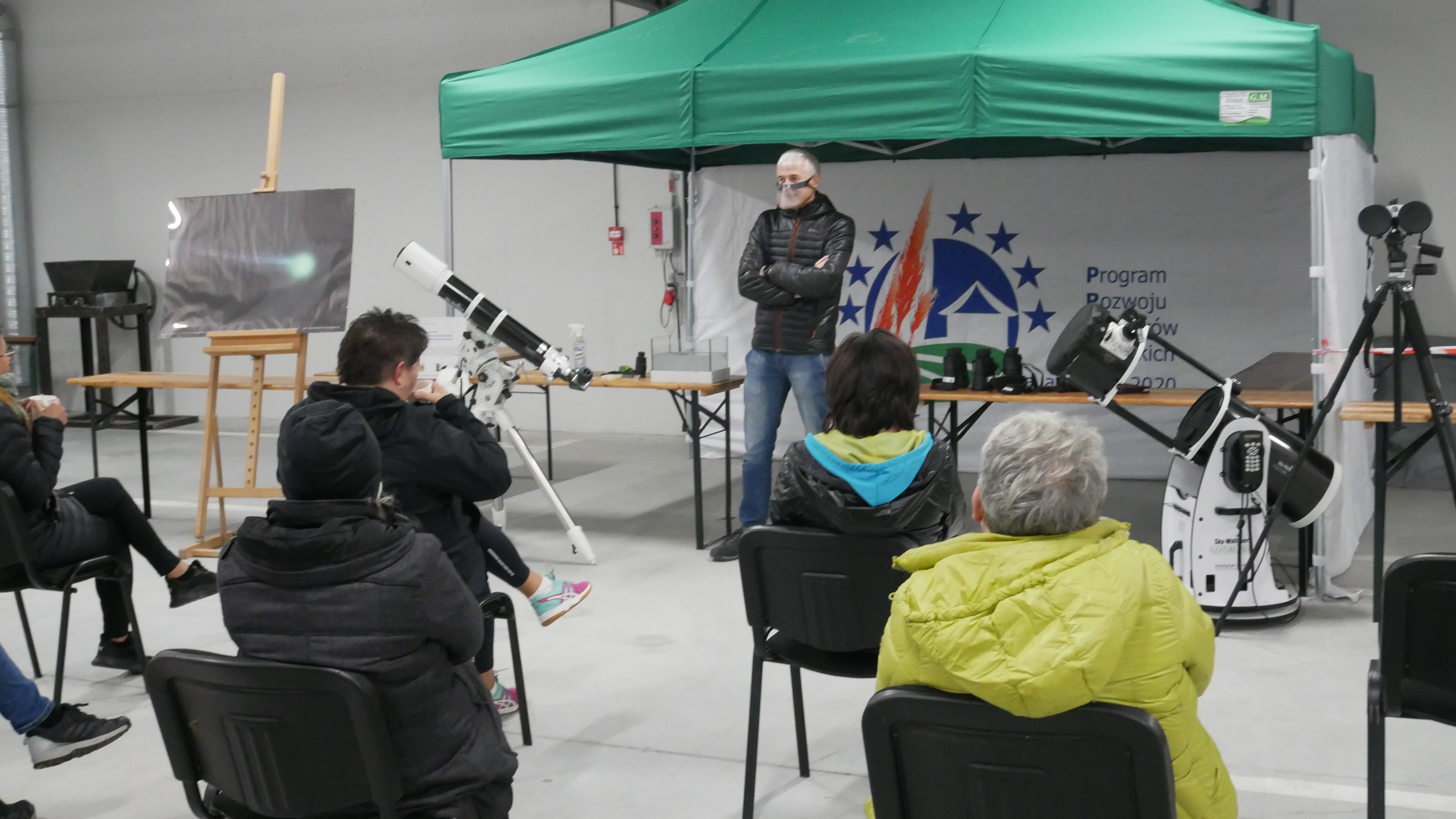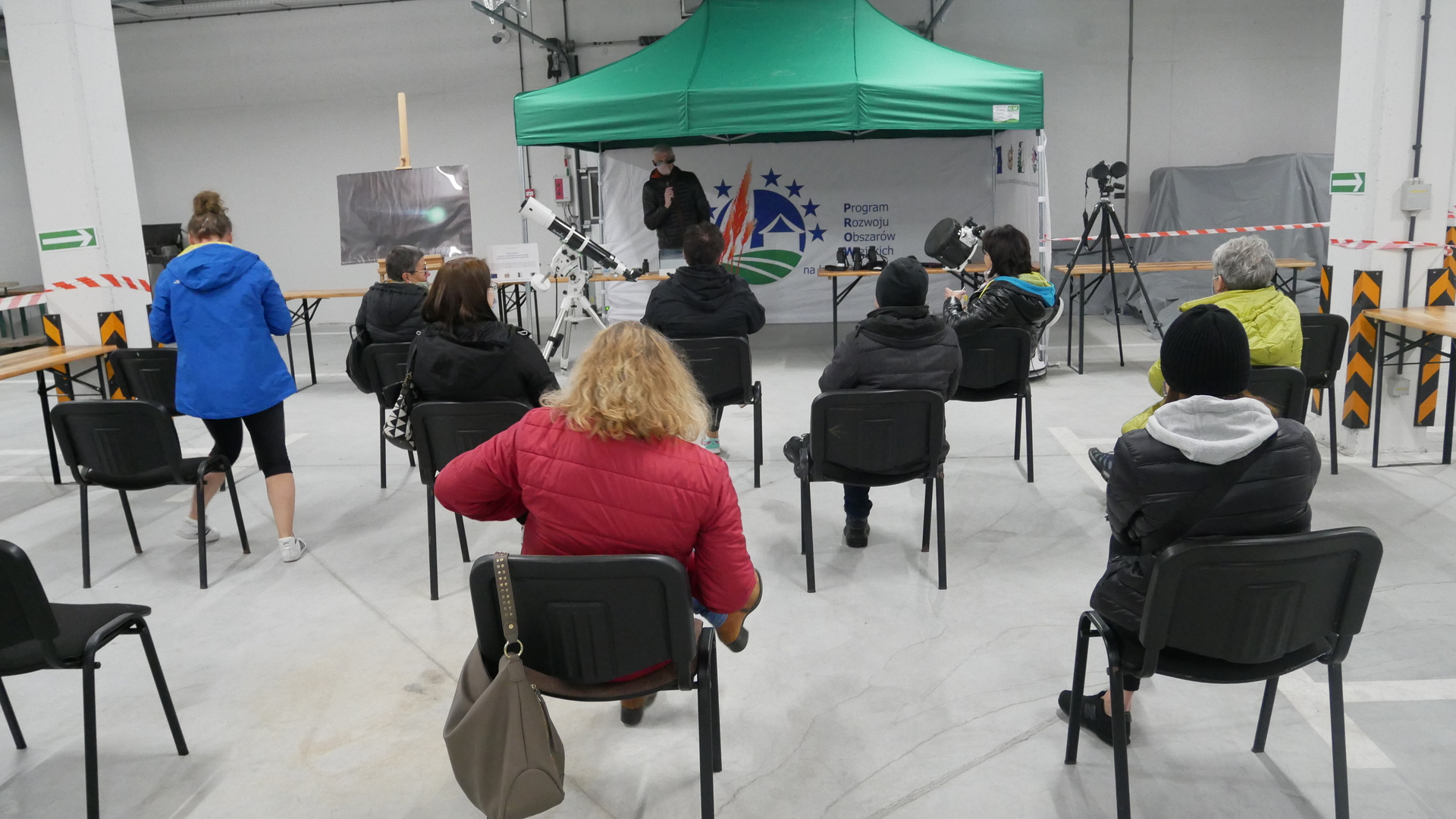 Pomimo niesprzyjającej aury wiele osób zdecydowało się znaleźć czas i odwiedzić w środowy wieczór (tj. 14.10.2020r.) ASTRO CENTRUM. Bo właśnie tam na placu obok obserwatorium i pomieszczeniach garażu odbywały się obserwacje i prezentacje sprzętu oraz wykłady dotyczące prowadzenia nocnych obserwacji. Można było zobaczyć różne rodzaje teleskopów, lunet i lornetek i dowiedzieć się jak samemu dokonywać obserwacji nieba. Każda osoba która uczestniczyła w spotkaniu dostawała pakiet zdjęć wydrukowanych w formie kartek pocztowych. Wszystkie te zdjęcia zostały wykonane przez nasze obserwatorium w Chełmcu. Ze względu na to że w październiku wieczory są chłodne organizator GOK w Chełmcu zadbał również o ciepłe napoje i ciepły poczęstunek dla uczestników obserwacji.