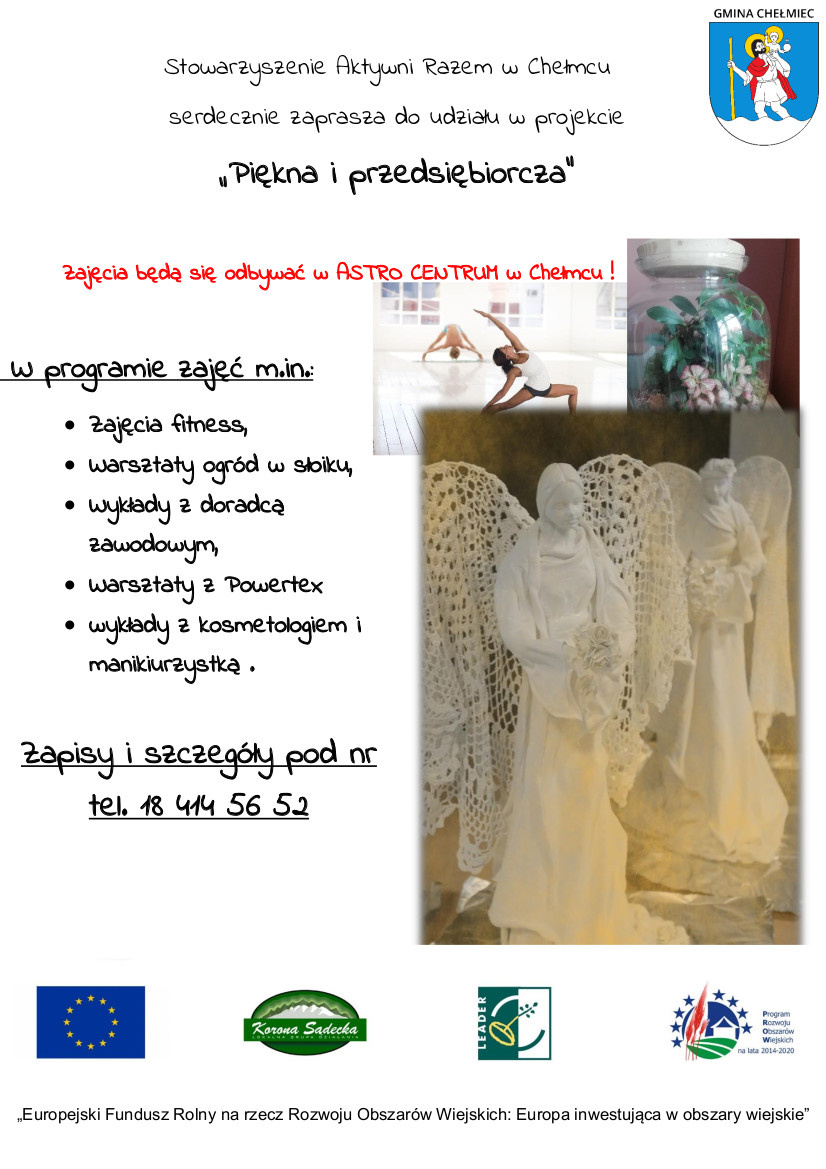 Zajęcia te są realizowane w ramach projektu pn. "Przedsiębiorcza i piękna - organizacja cyklu warsztatów tematycznych połączona ze spotkaniami z doradcą zawodowym".