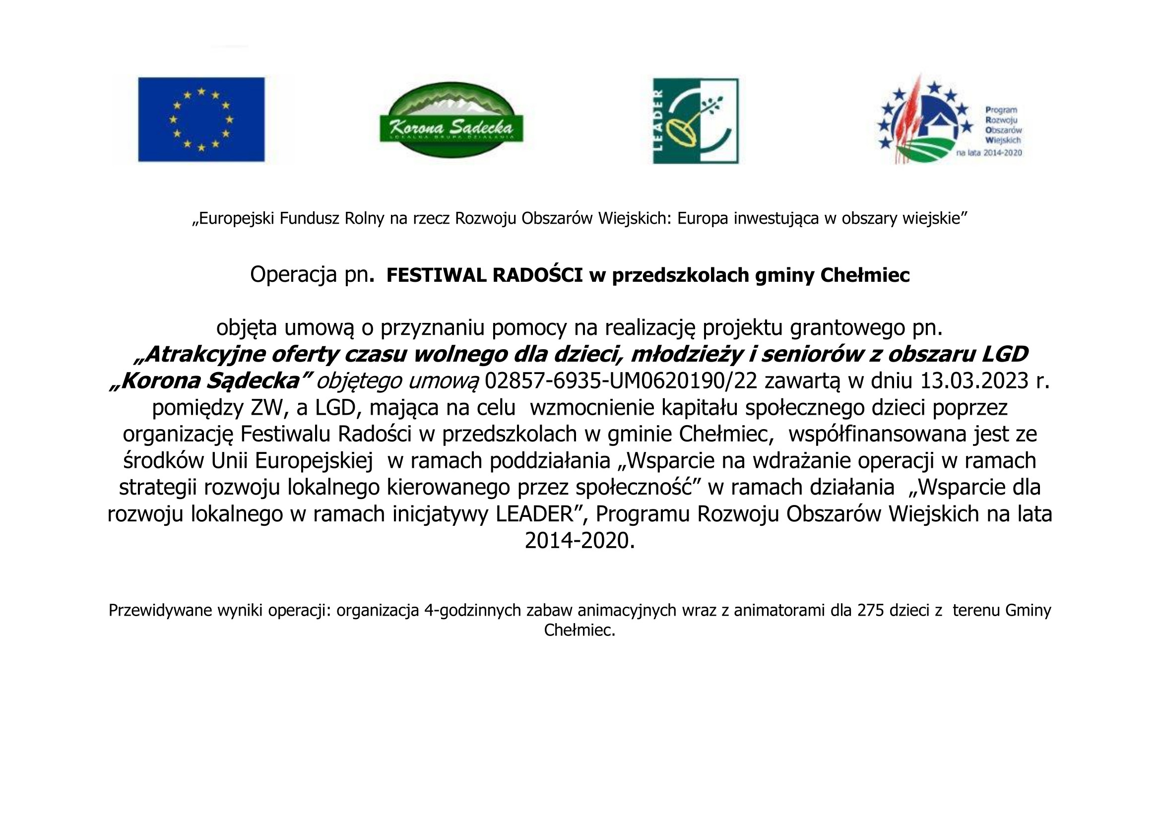 Zachęcamy oddziały przedszkolne z przedszkoli z gminy Chełmiec do udziału w planowanym wydarzeniu poprzez złożenie formularza zgłoszeniowego do dnia 29.08.2023 r. do siedziby Stowarzyszenia tj. ul. Papieska 2, 33-300 Nowy Sącz. Bliższe informacje pod numerem telefonu: 606 975 247.