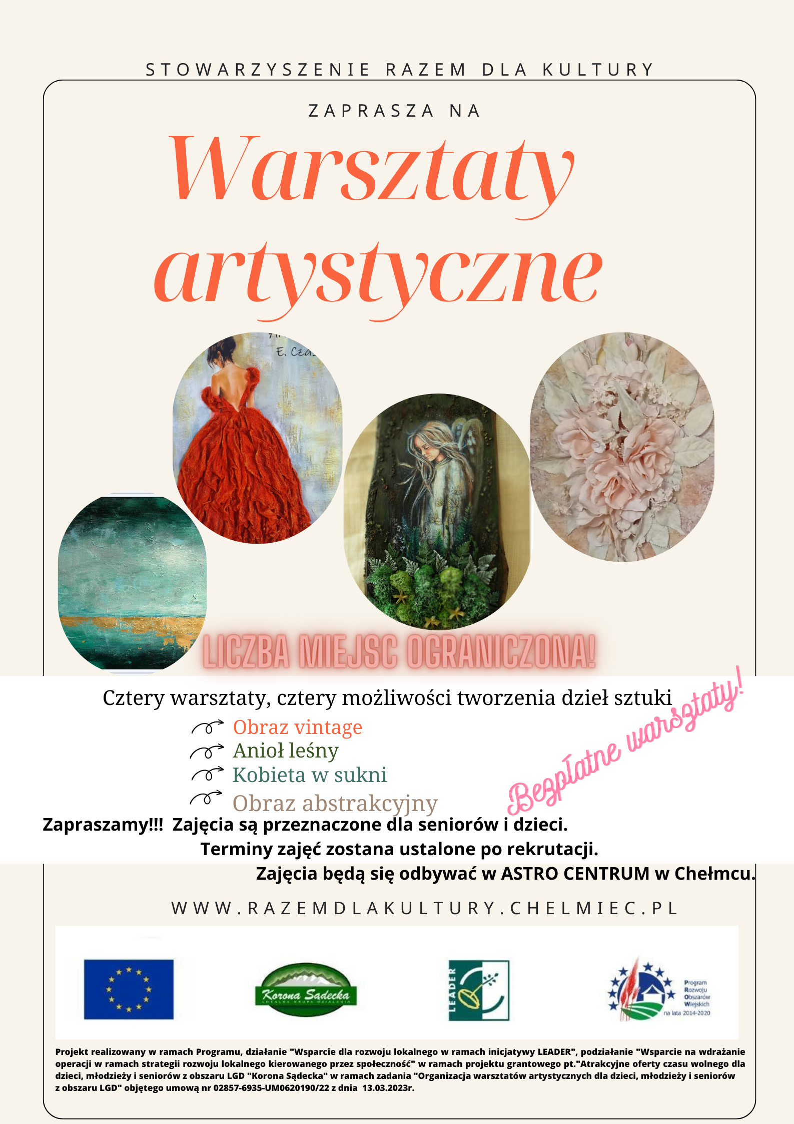 Projekt realizowany w ramach Programu, działanie "Wsparcie dla rozwoju lokalnego w ramach inicjatywy LEADER", podziałanie "Wsparcie na wdrażanie operacji w ramach strategii rozwoju lokalnego kierowanego przez społeczność" w ramach projektu grantowego pt."Atrakcyjne oferty czasu wolnego dla dzieci, młodzieży i seniorów z obszaru LGD "Korona Sądecka" w ramach zadania "Organizacja warsztatów artystycznych dla dzieci, młodzieży i seniorów z obszaru LGD" objętego umową nr 02857-6935-UM0620190/22 z dnia 13.03.2023r.