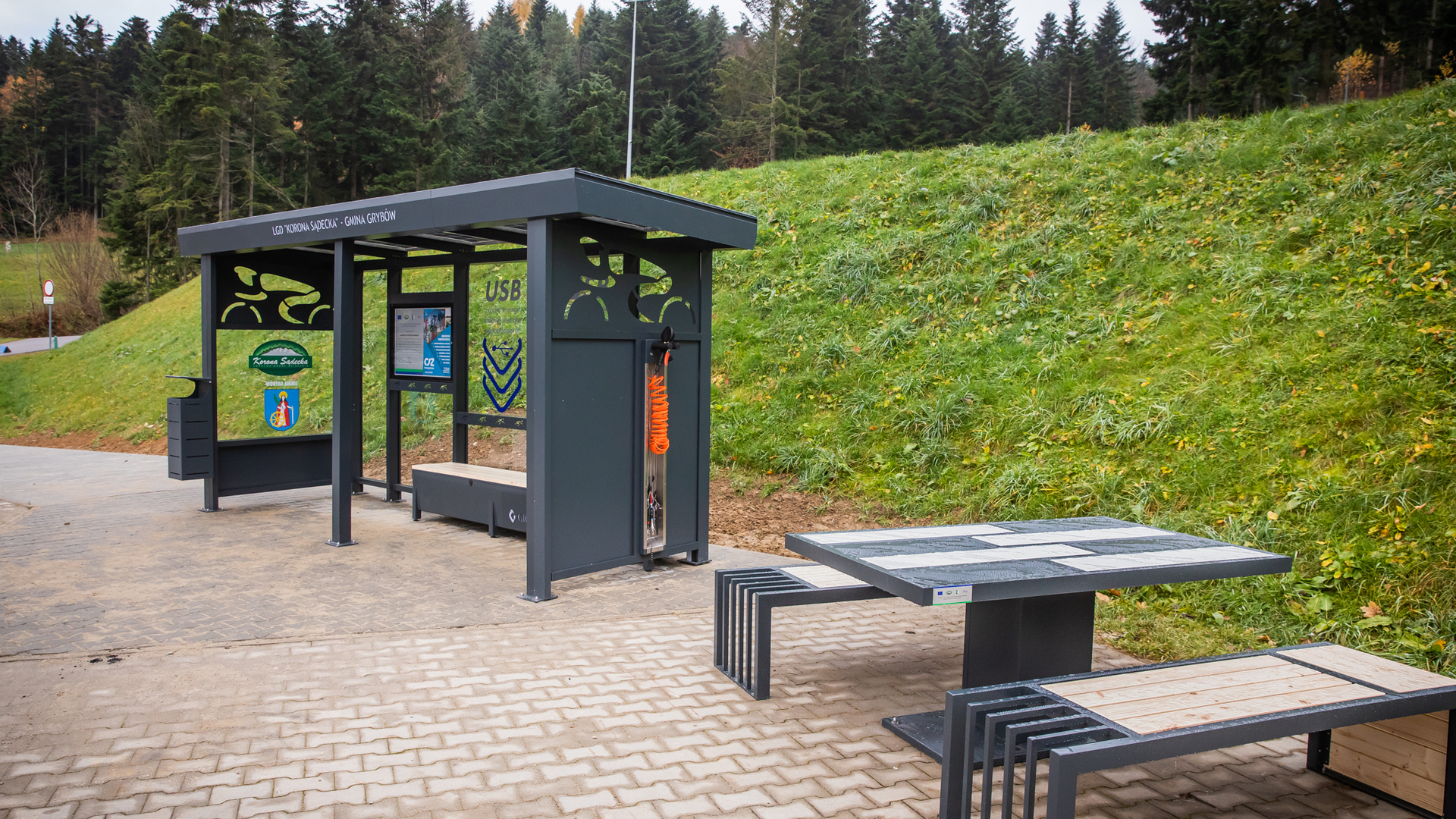 Powstała architektura obejmuje: wiatę rowerową, zestaw parkowy do odpoczynku, stację naprawczą rowerów oraz interaktywną mapę, dzięki której turyści i rowerzyści mogą zapoznać się