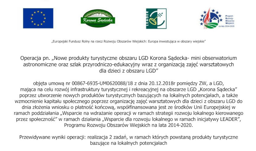 Projekt grantowy "Nowe produkty turystyczne obszaru LGD "Korona Sądecka" - mini obserwatorium astronomiczne oraz szlak przyrodniczo-edukacyjny wraz z organizacją zajęć warsztatowych dla dzieci z obszaru LGD"